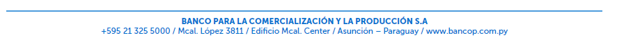 - Conforme a los términos de la Ley 6.534/2020 “De protección de datos personales crediticios”, el TITULAR autoriza al Banco a tratar, recabar, procesar, proveer, almacenar y/o difundir cualquier tipo de información referente a sus datos personales (nacionalidad, cédula de identidad, RUC, domicilio, estado civil, lugar de trabajo, teléfono particular, laboral y móvil); así como antecedentes civiles, penales actividad comercial/laboral, información crediticia (positiva o negativa), situación patrimonial, solvencia económica, nivel de endeudamiento y datos del cumplimiento de sus obligaciones comerciales e impositivas, de cualquier empresa y/o entidad, pública o privada, nacional o extranjera dedicada a la gestión de bases de datos personales o crediticios, como ser Informconf, Equifax, Infomercio, BICSA, Central de Informaciones del Banco Central del Paraguay, Central de Riesgo Bancard, haciendo extensiva esta autorización a dichas empresas y/o cualquier otra empresa y/o institución dedicada al tratamiento y almacenamiento de datos que pudiera existir en el país o en el extranjero en el futuro. El Banco informa al TITULAR que la información a la que acceda será utilizada para el conocimiento cabal de sus datos y el cumplimiento de sus obligaciones, para eventualmente utilizarla como elemento de juicio en el análisis crediticio y de riesgo que como entidad financiera debe realizar para poder ofrecer al TITULAR préstamos y otros servicios bancarios, conforme a sus políticas crediticias, de riesgo y de cumplimiento. De igual manera y en los mismos términos de la autorización que antecede, el TITULAR autoriza al BANCO a incluir en el registro de empresas que administran bases de datos e informaciones sean éstas nacionales y/o internacionales, datos suyos como los citados al inicio de la presente cláusula. La eliminación de la información en los registros se realizará de acuerdo con los términos establecidos en la legislación vigente.